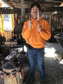 At the forging process, once I twisted the nail head 360 degree. So sophisticated handle shape came from this twist while nail head temperature was in 1700 F degree, with using vice and jig.