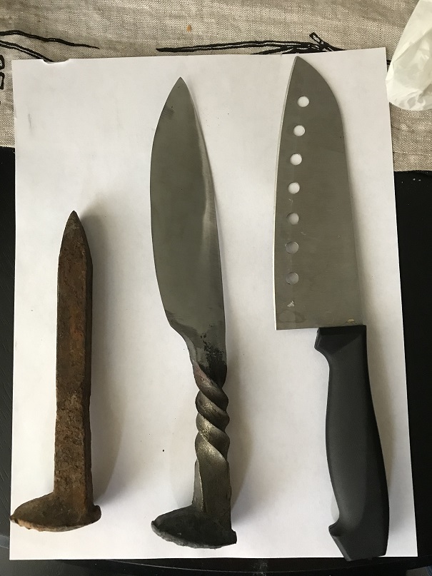 Photo of final shape is there. Left end is the material, large steel nail. Center is the forging made knife by me. Far right is Cooking Knife for dimension comparison. I did both Quenching into the oil and Annealing.